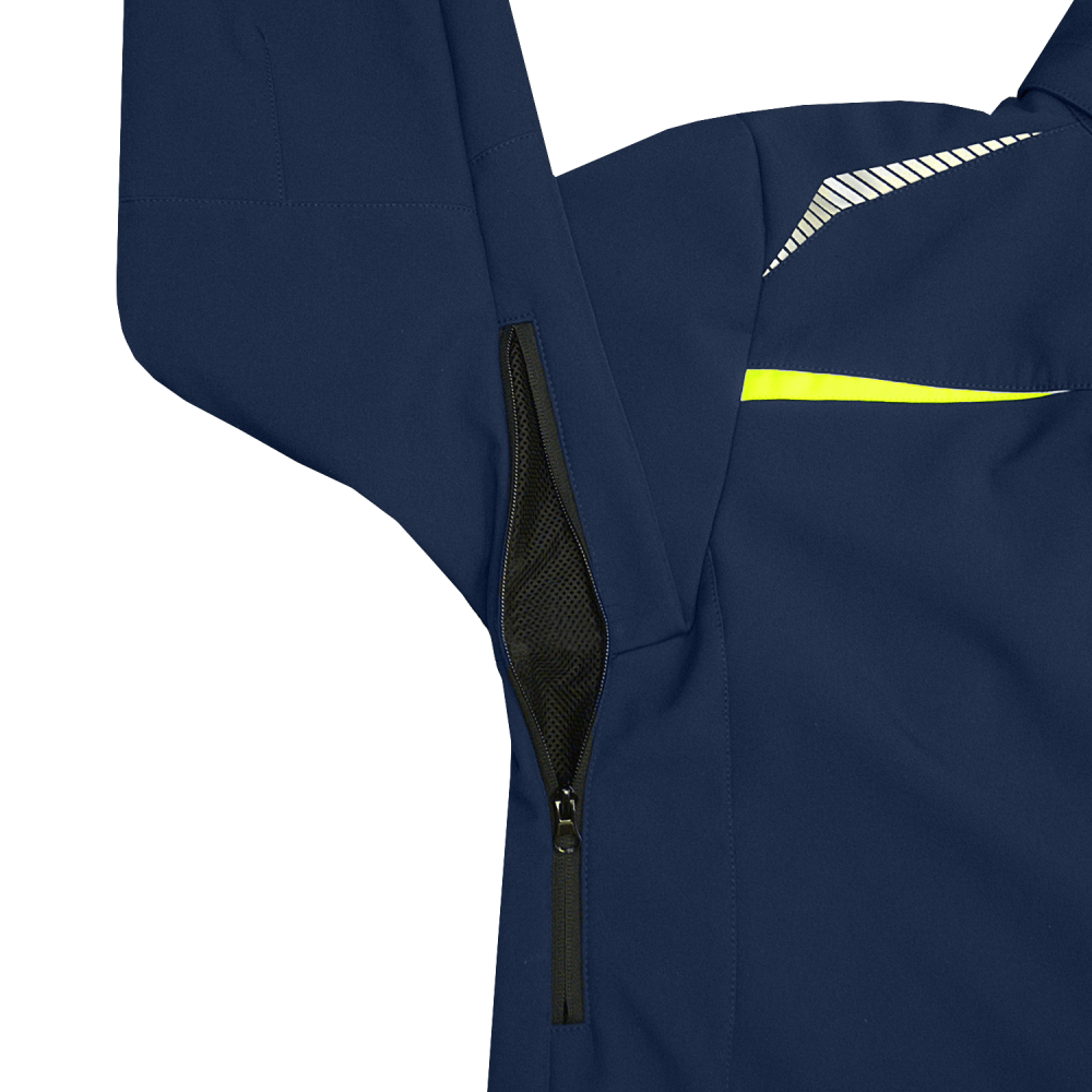 Softshell jaka, piemērota pavasara, vasaras un rudens sezonām, nodrošina komfortu un aizsardzību dažādos laikapstākļos. Tumši zila ar spilgti dzelteniem rāvējslēdzējiem un modernu dizainu.