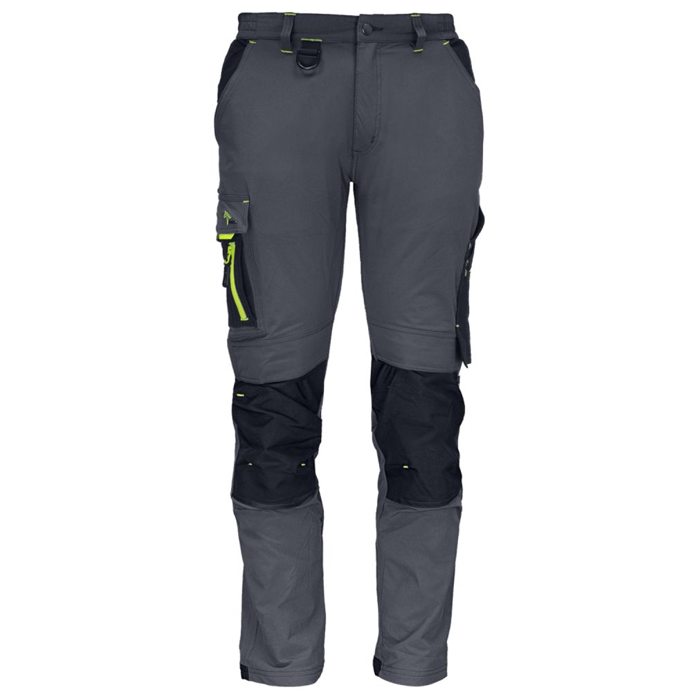 Darba bikses AirFlex izgatavotas no augsti elastīga 4 virzienu stiepuma materiāla, nodrošinot lielisku kustību brīvību un komfortu darba laikā. Moderns dizains ar pelēku audumu un spilgti zaļiem akcentiem. Var kombinēt ar atbilstošu jaku vai softshell jaku.