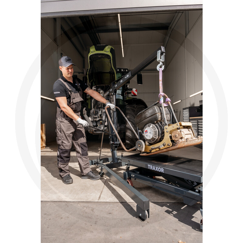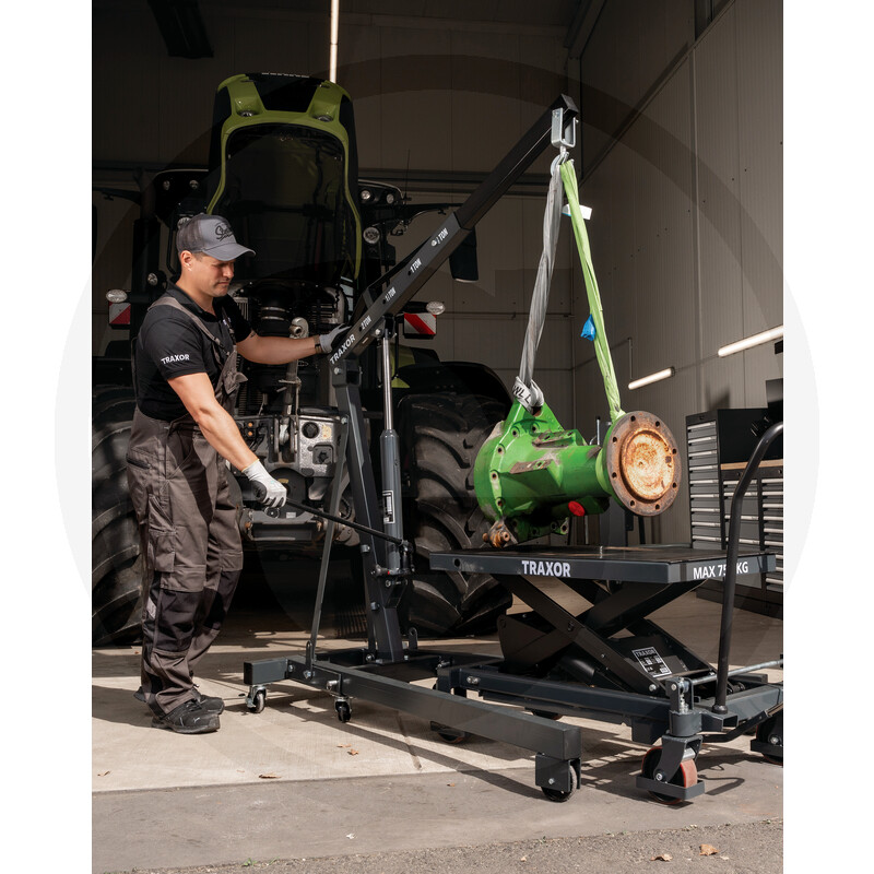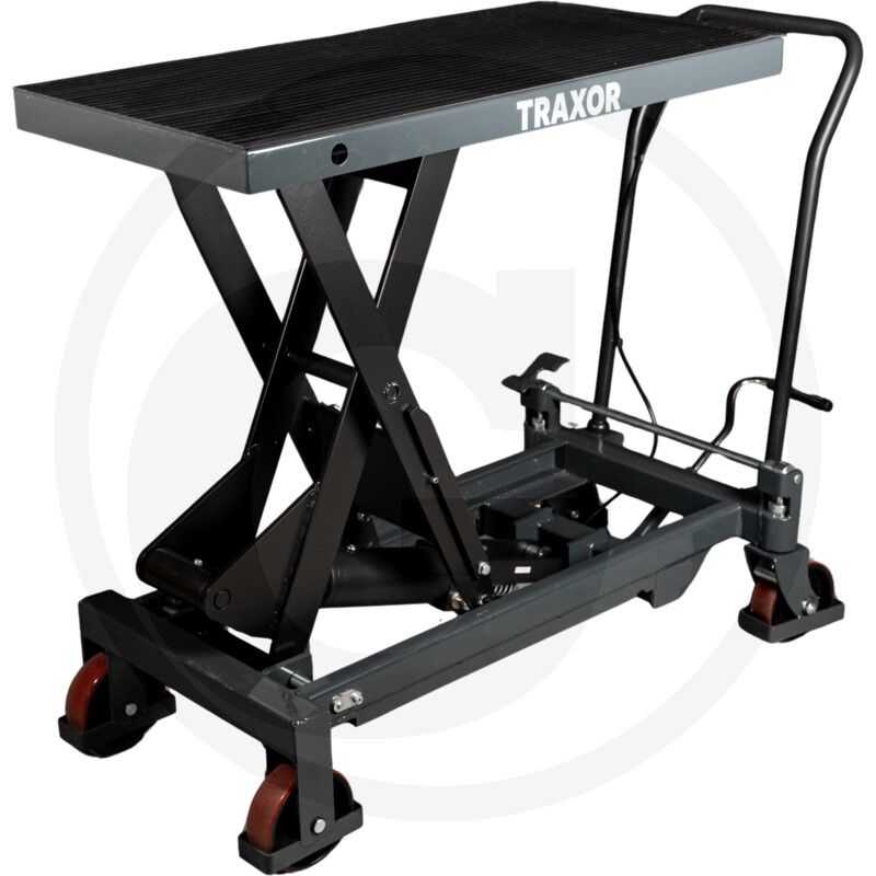 TRAXOR HT750-M ir mobils hidrauliskais šķērveida pacelšanas galds, kas paredzēts drošai un ērtai kravu pacelšanai, transportēšanai un apkopei. Pacelšana notiek ar kājas pedāli, bet nolaišana – ar ērtu rokturi, nodrošinot precīzu augstuma regulāciju. Aprīkots ar diviem grozāmiem riteņiem ar stāvbremzi un kāju aizsardzību, kā arī poliuretāna riteņiem, kas garantē klusu un vienmērīgu kustību.
