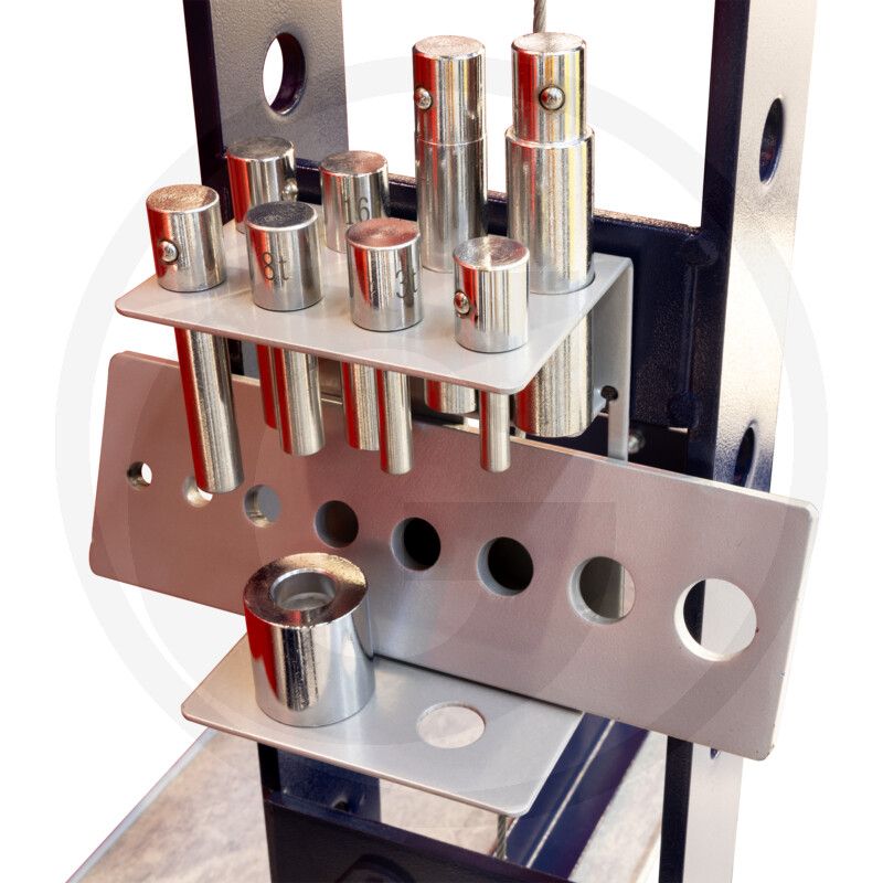 TRAXOR 10 daļīgais spiedstieņu komplekts ir paredzēts hidrauliskajām presēm un nodrošina precīzu un drošu darbību, veicot gultņu un bukses presēšanu, metāla liekšanu, caurumošanu un štancēšanu. Komplektā iekļauta izturīga perforētā plāksne, ātrās nomaiņas patrona, kā arī 8 spiedstieņi, kas paredzēti dažādām preses jaudām no 2 līdz 20 tonnām. Šis komplekts ir būtisks instruments profesionālai metālapstrādei un remonta darbiem.