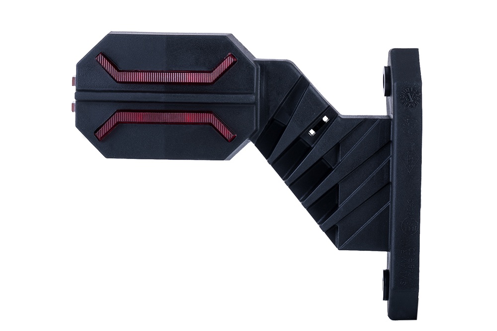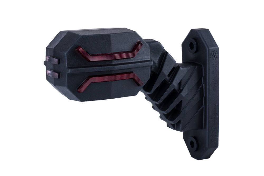 Trīsfunkcionāls marķējuma lukturis uz gara diagonāla stiprinājuma, paredzēts uzstādīšanai transportlīdzekļa kreisajā pusē.