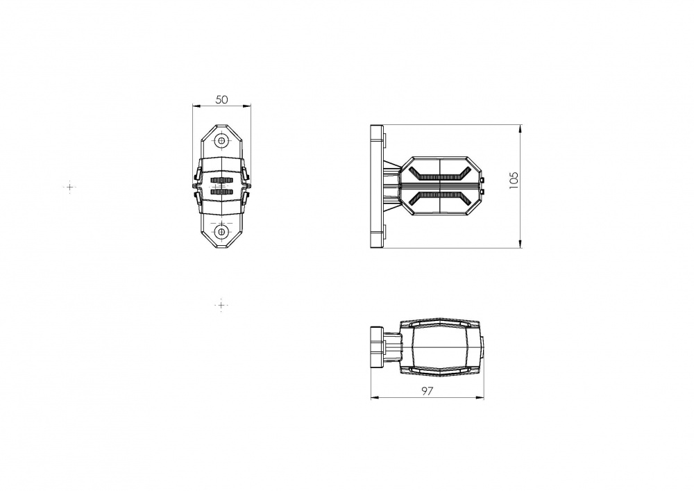 Trīsfunkcionāls marķējuma lukturis uz gara diagonāla stiprinājuma, paredzēts uzstādīšanai transportlīdzekļa kreisajā pusē.