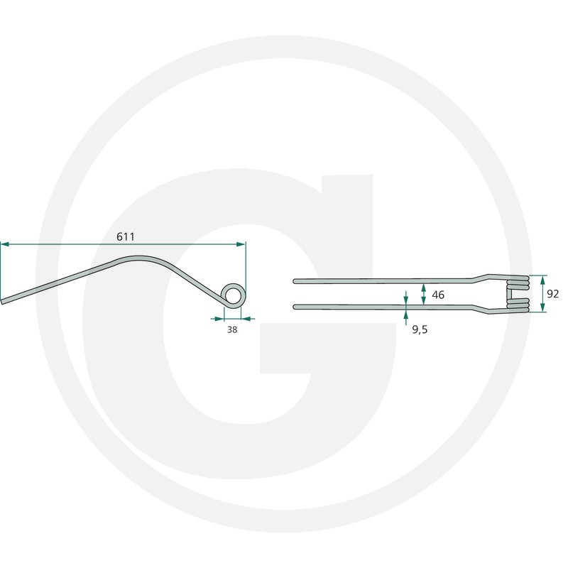Rotējošā grābekļa zars, 611x92 Ø9,5 mm