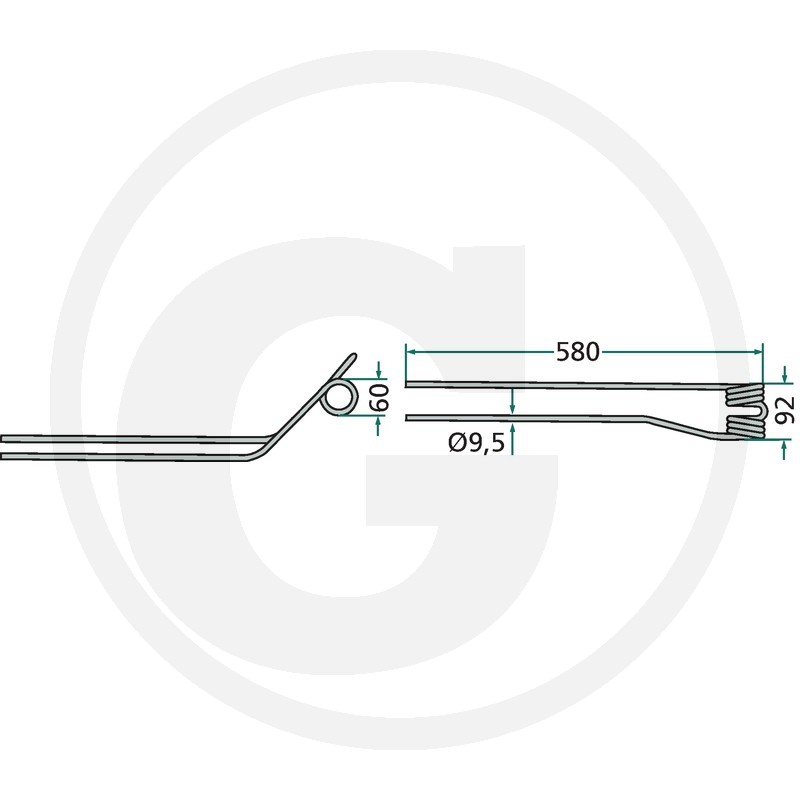 Rotējošā grābekļa zars, 580x92 Ø9,5 mm, labā puse iekšpuse