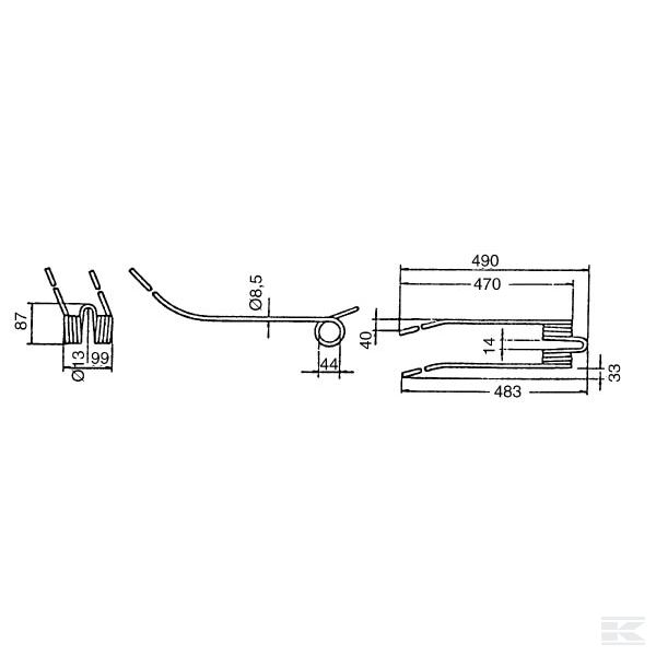Rotējošā grābekļa zars, 490x99 Ø8,5 mm