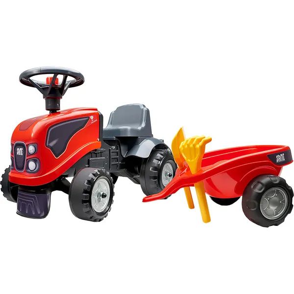 Spēļu traktors bez pedāļiem - skrienamais, komplektā ar mini piekabi ar lāpstu un grābekli.